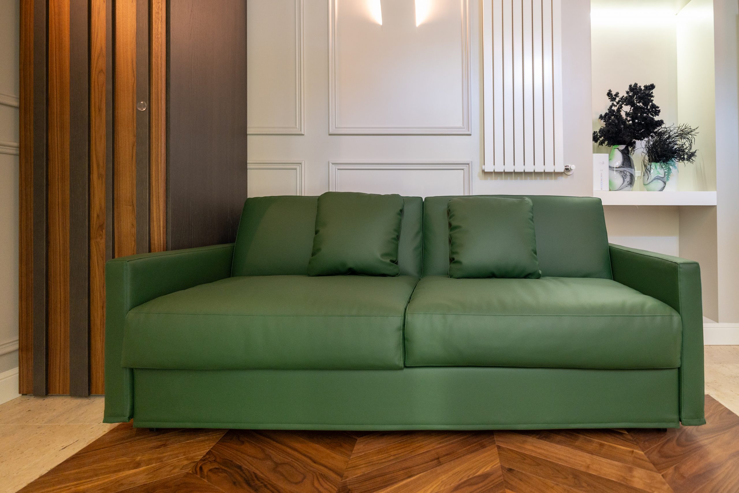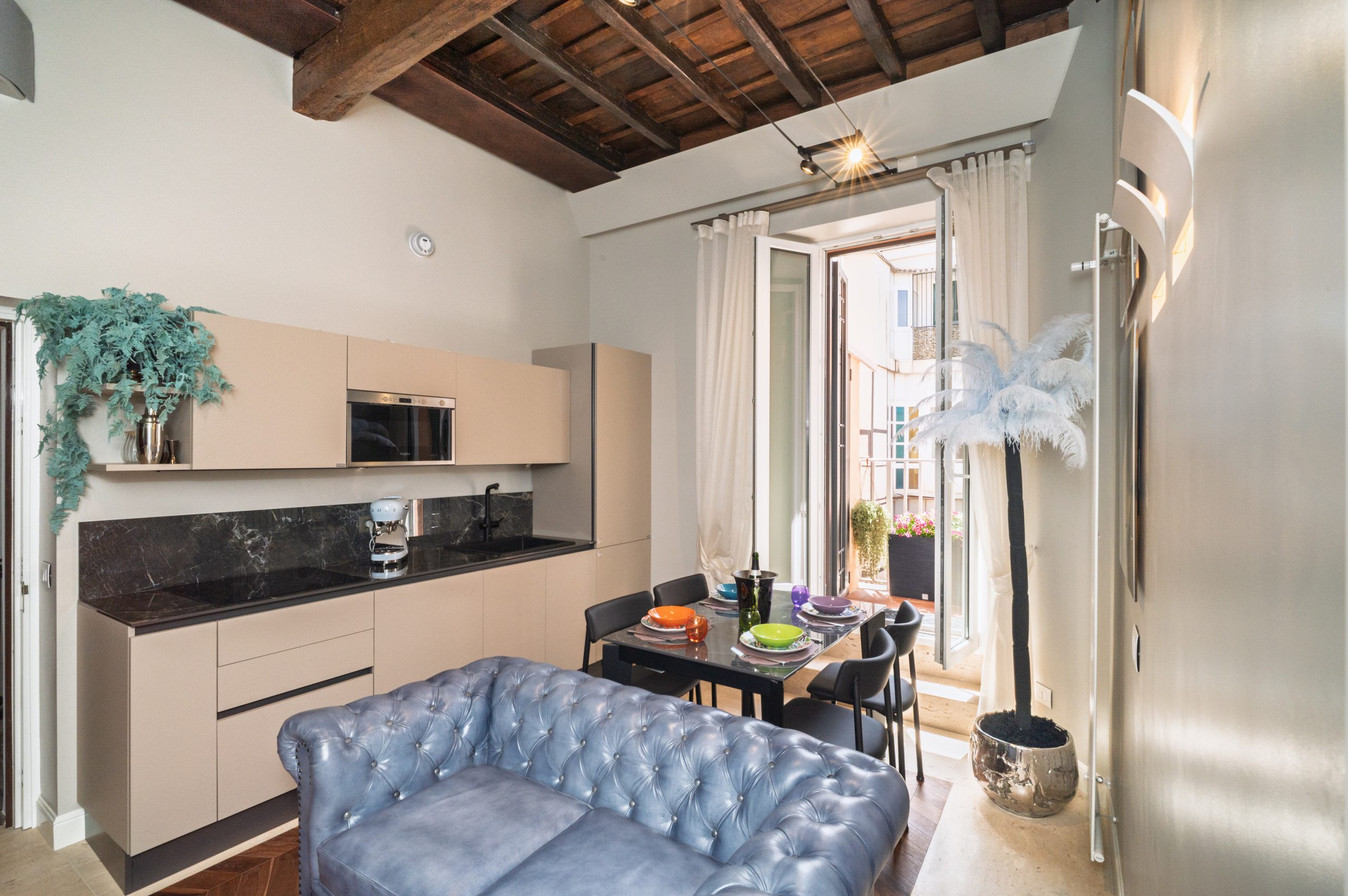 In the living area there is a contemporary kitchen equipped with cutting-edge appliances that fits harmoniously into spaces designed for maximum comfort. Also in the large and bright living area you can relax thanks to the presence of a comfortable sofa and television with OLED technology and a Hi-End stereo system. You will also find a small and charming balcony from where you can admire a small fountain from the 1800s … these things only happen in Rome.