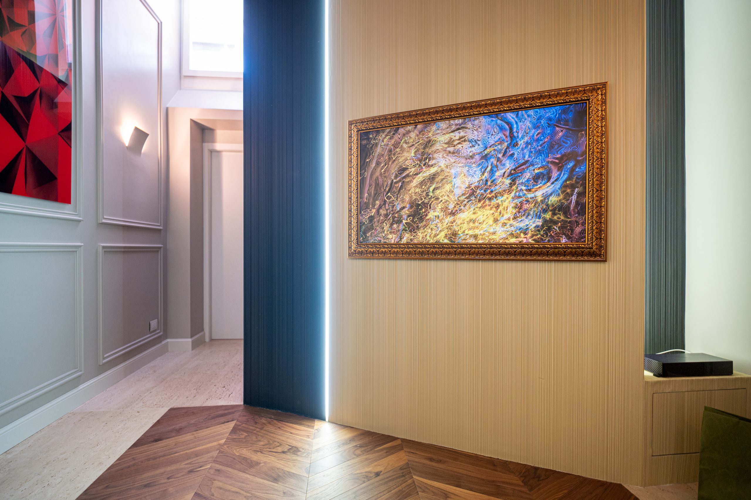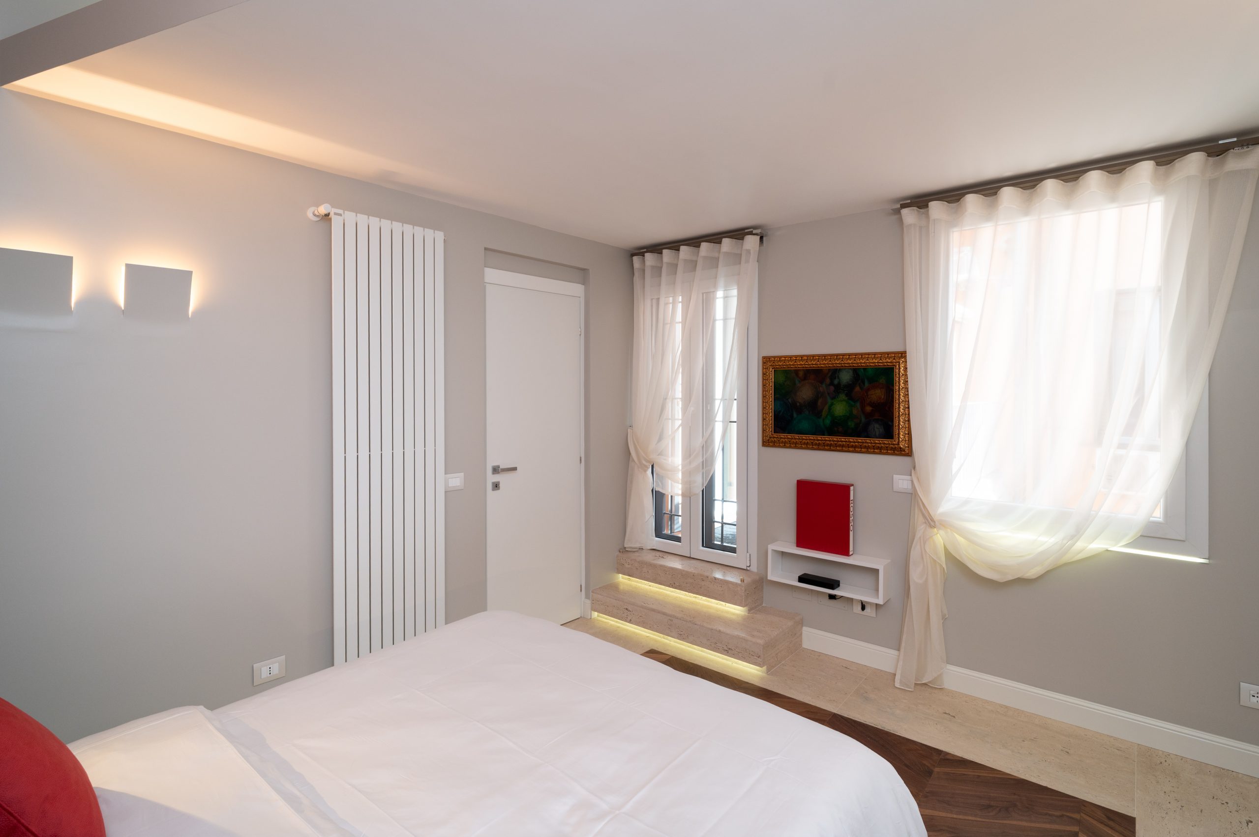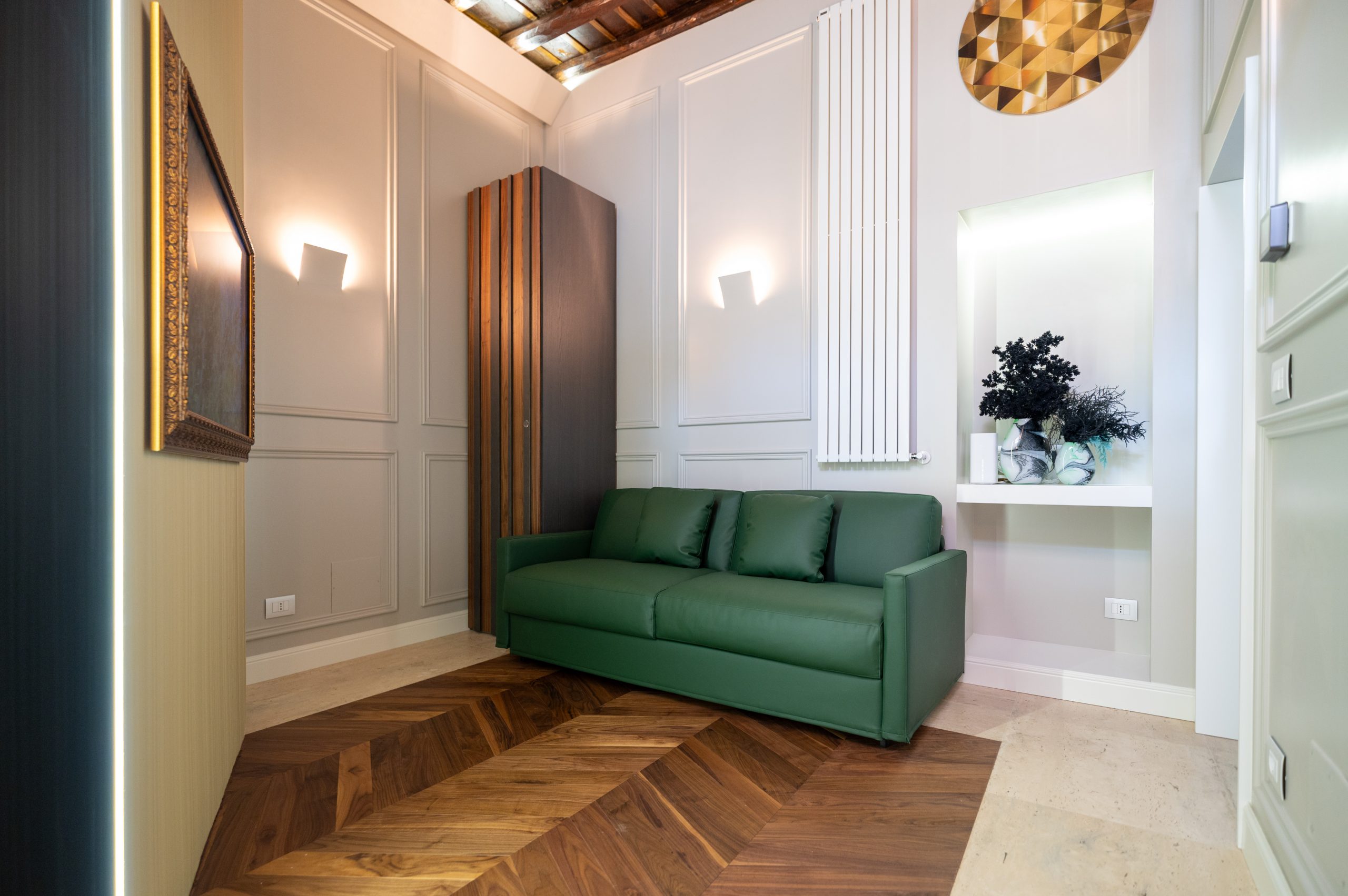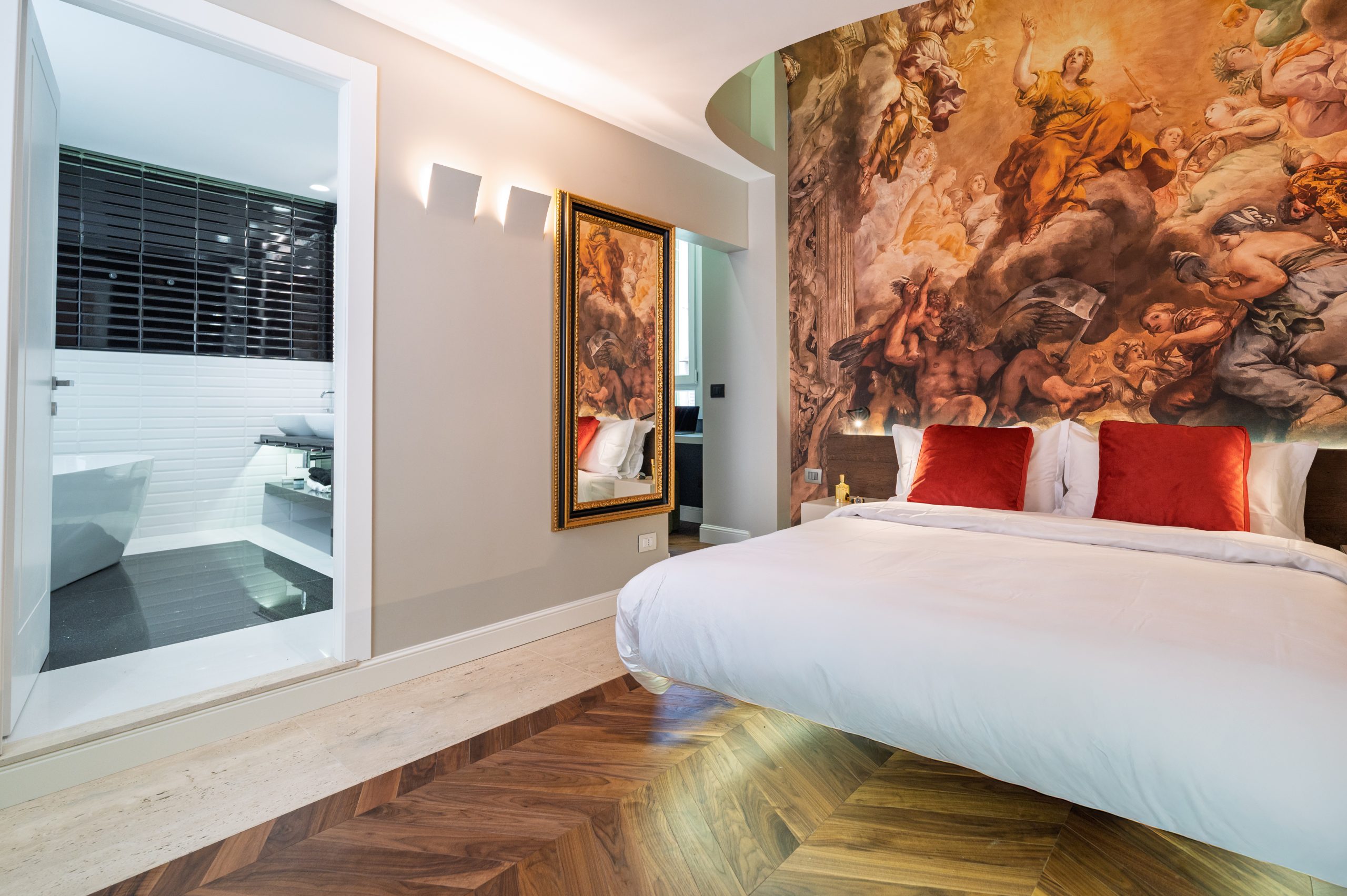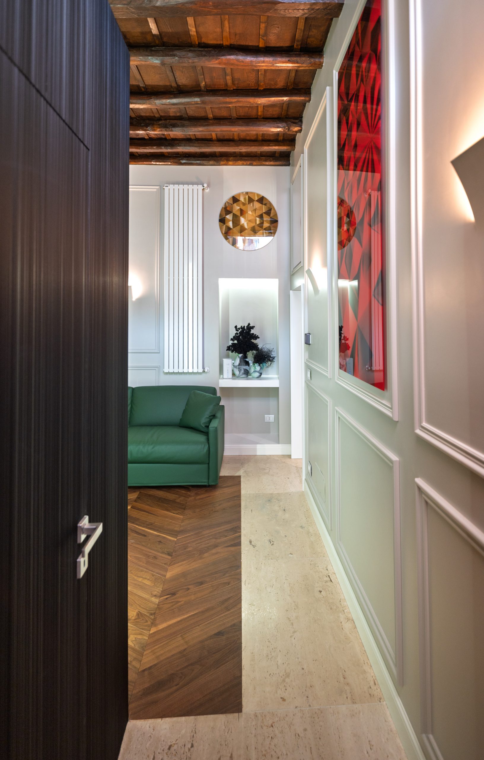The interiors feature high ceilings with original wooden beams, combined with modern finishes of the highest level. The Roman travertine and parquet floors are combined with soundproofed glass to ensure tranquility.