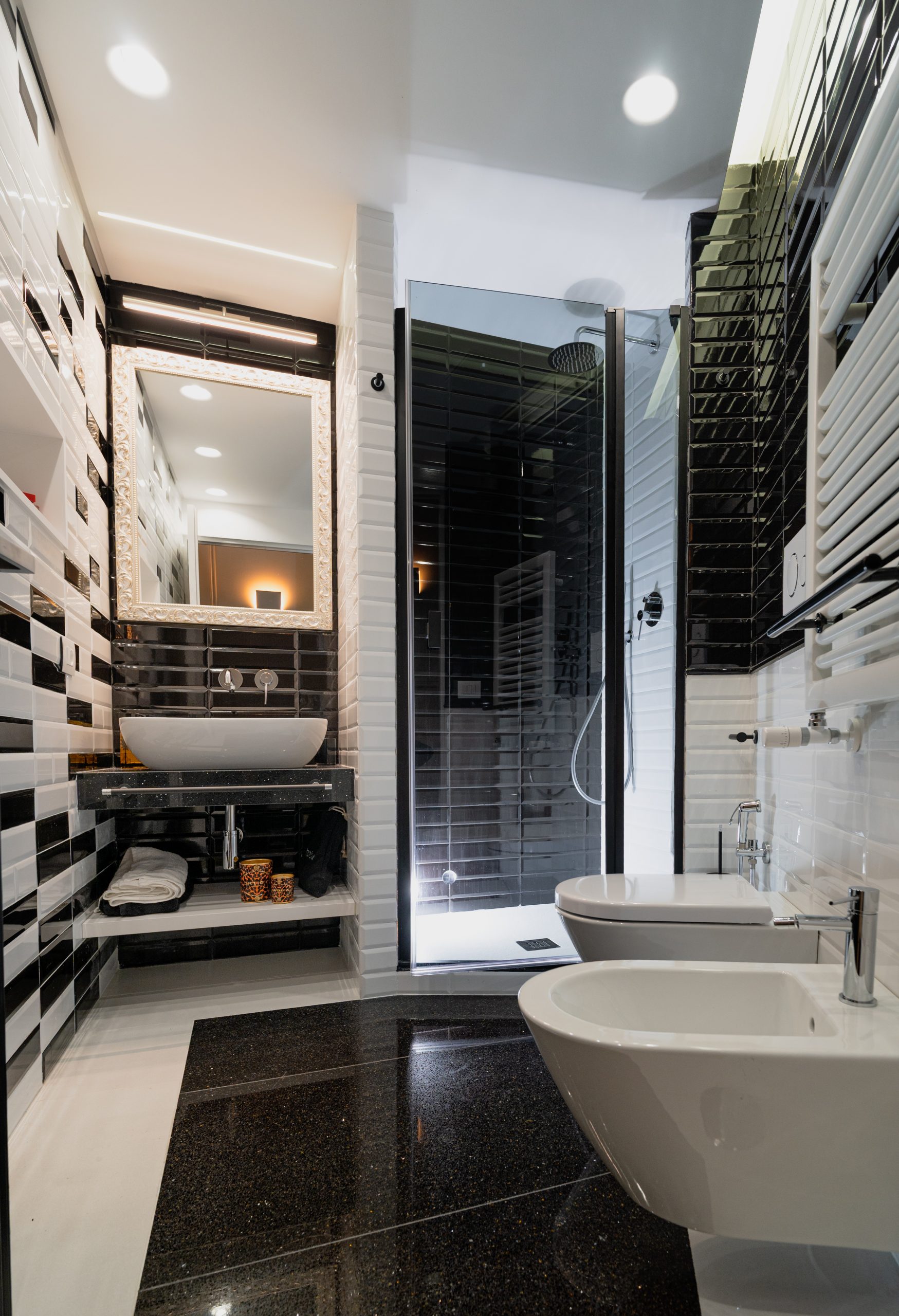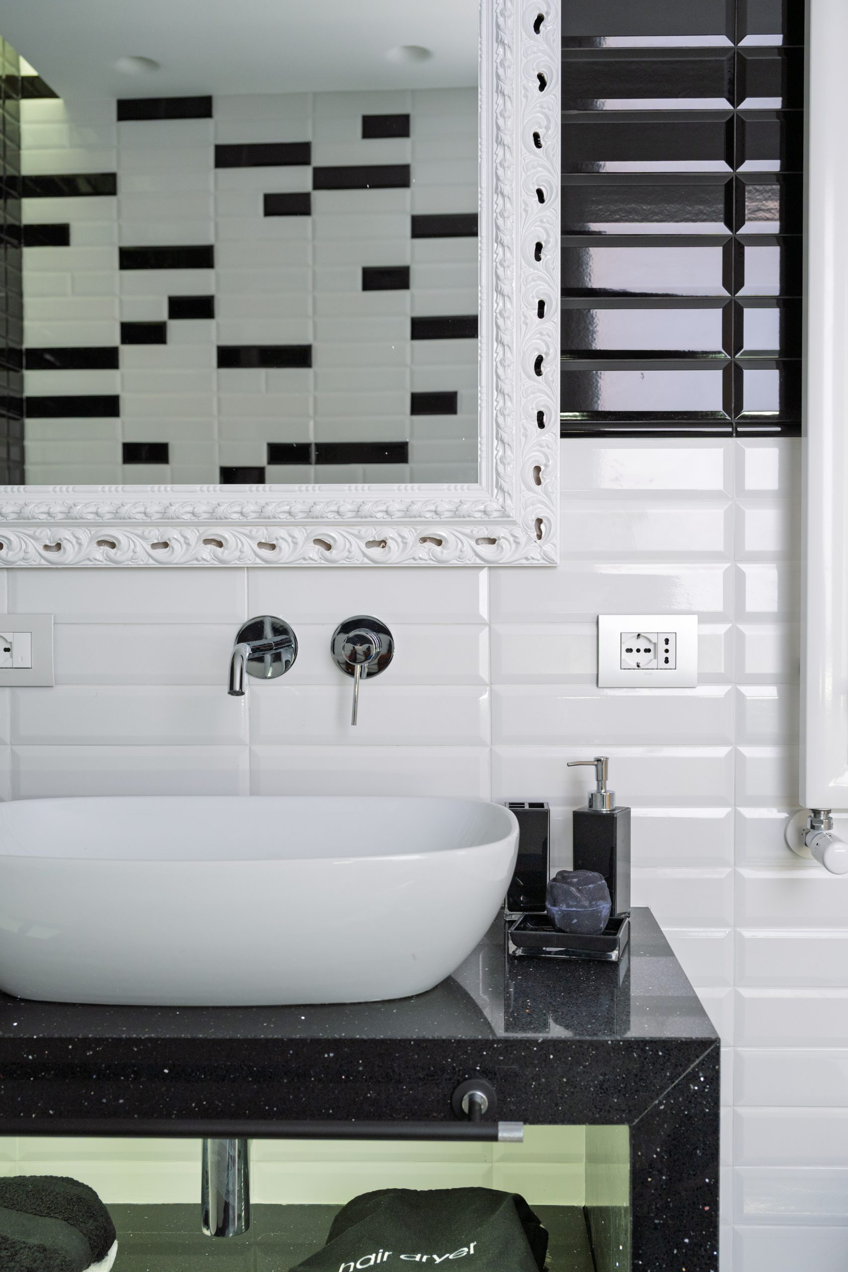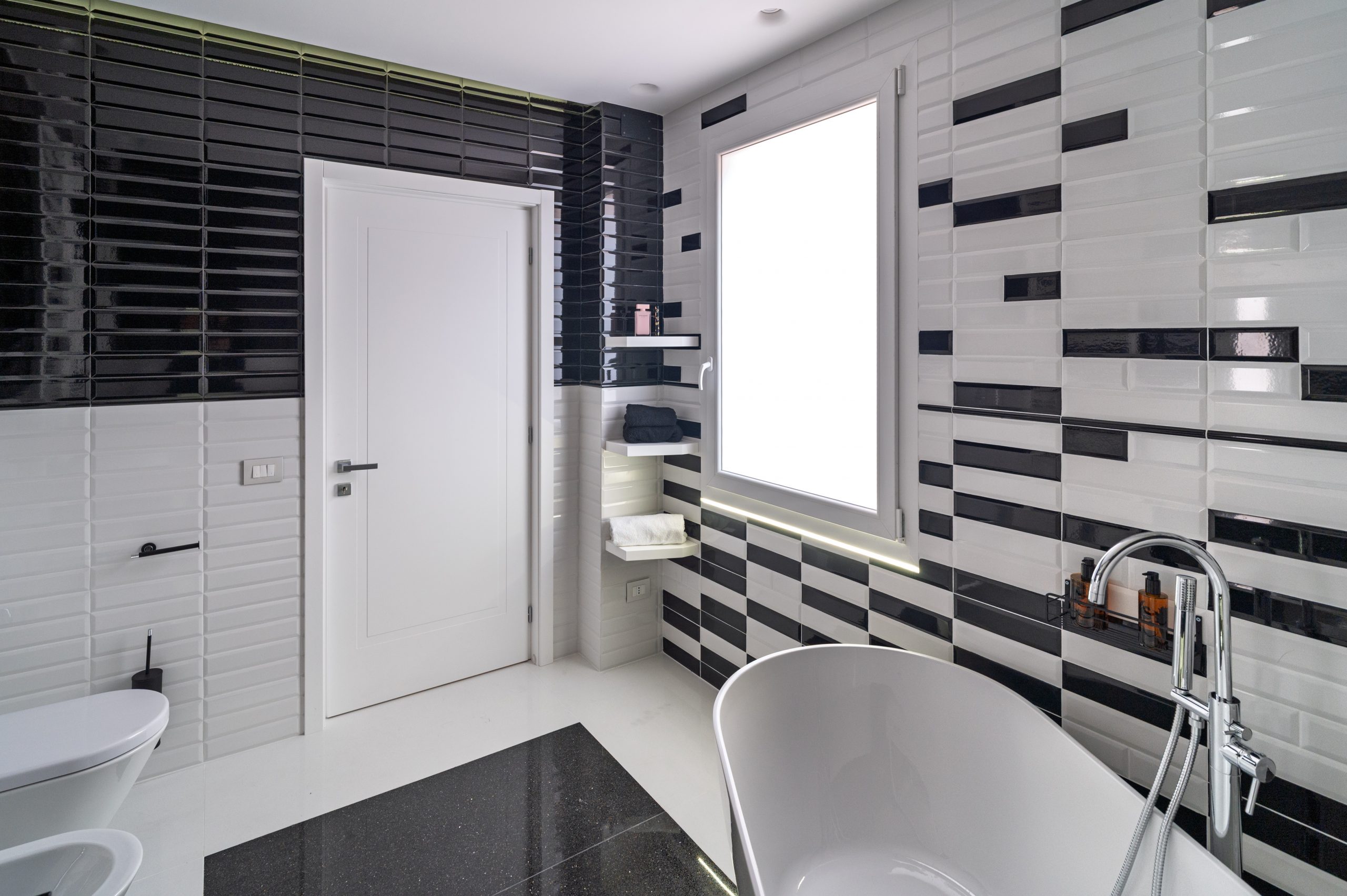The master bedroom is spacious and welcoming with an en suite bathroom embellished with black & white style ceramics of great visual impact and with the presence of a large bathtub.