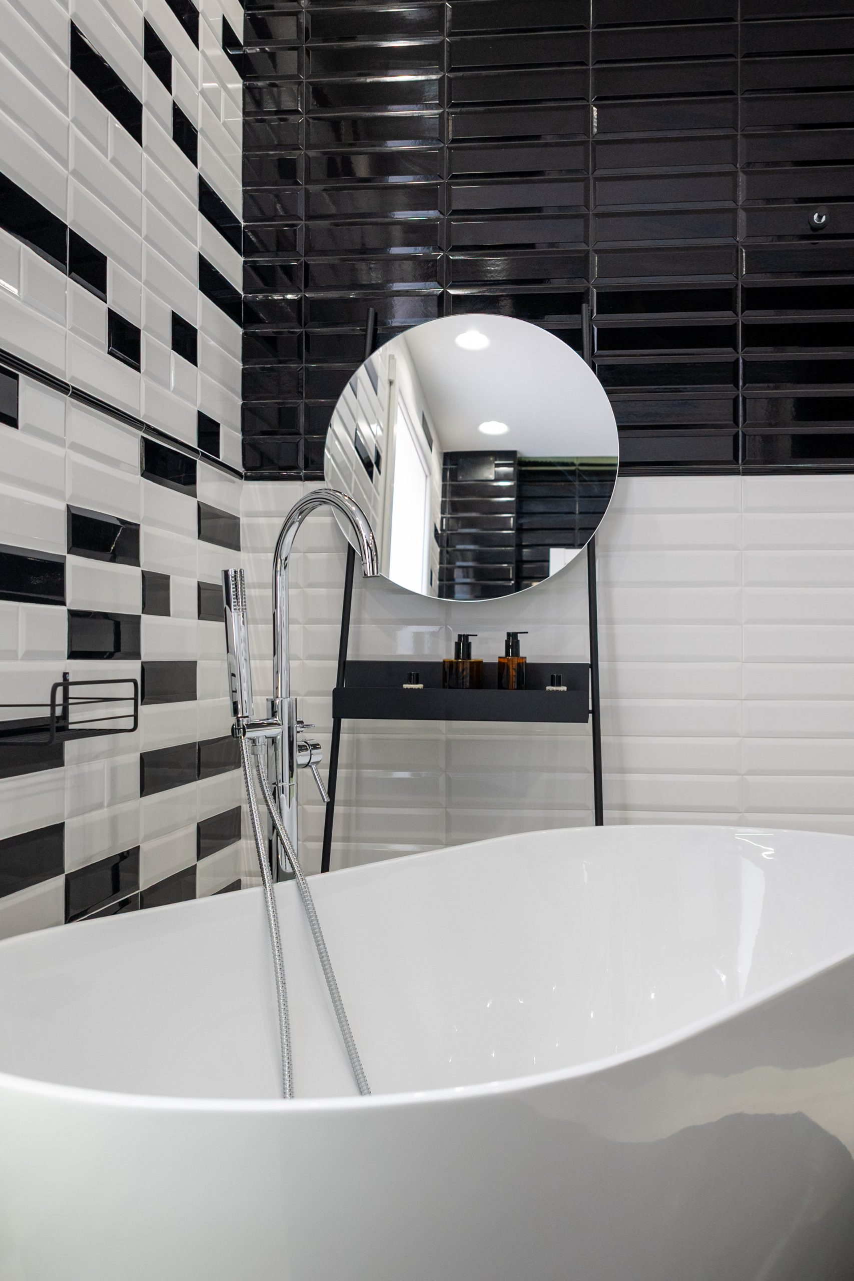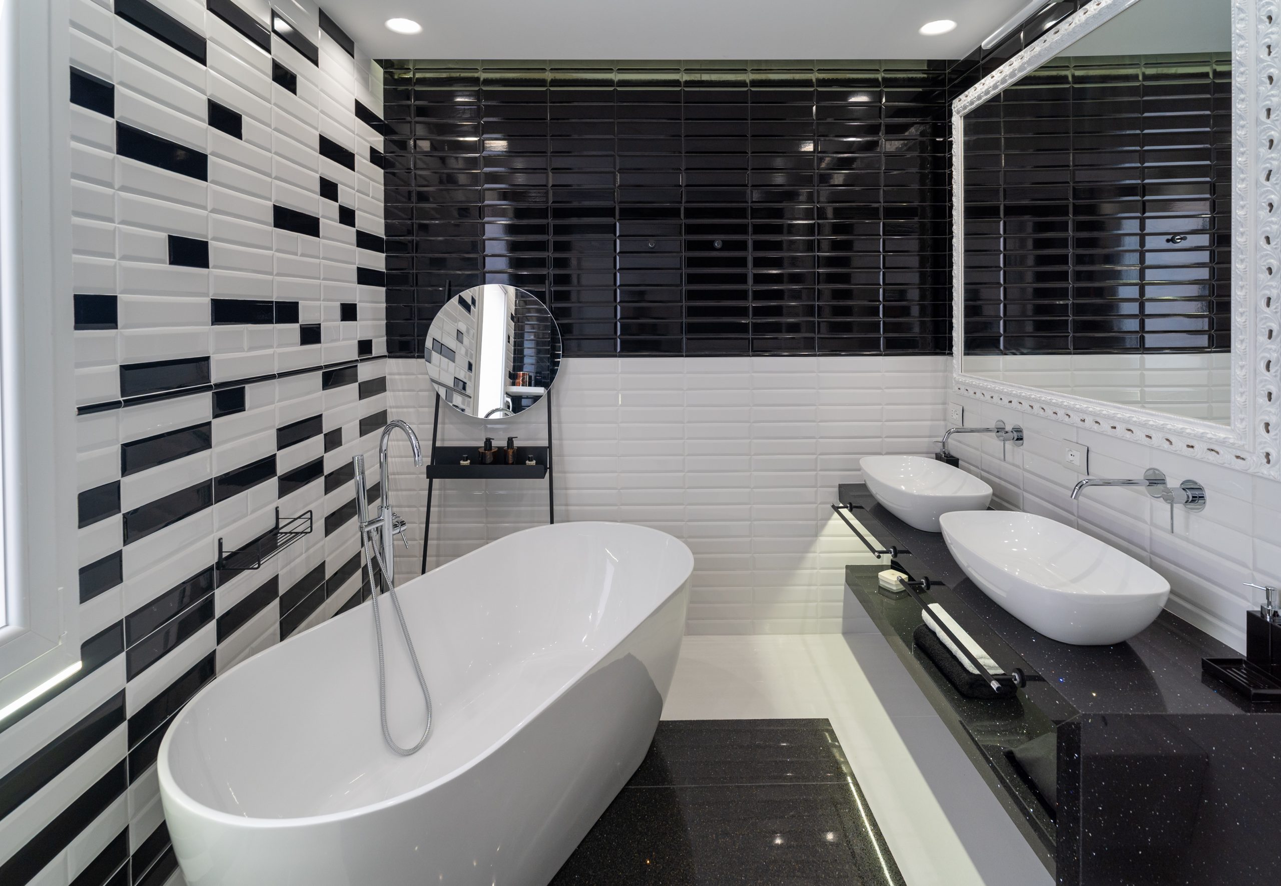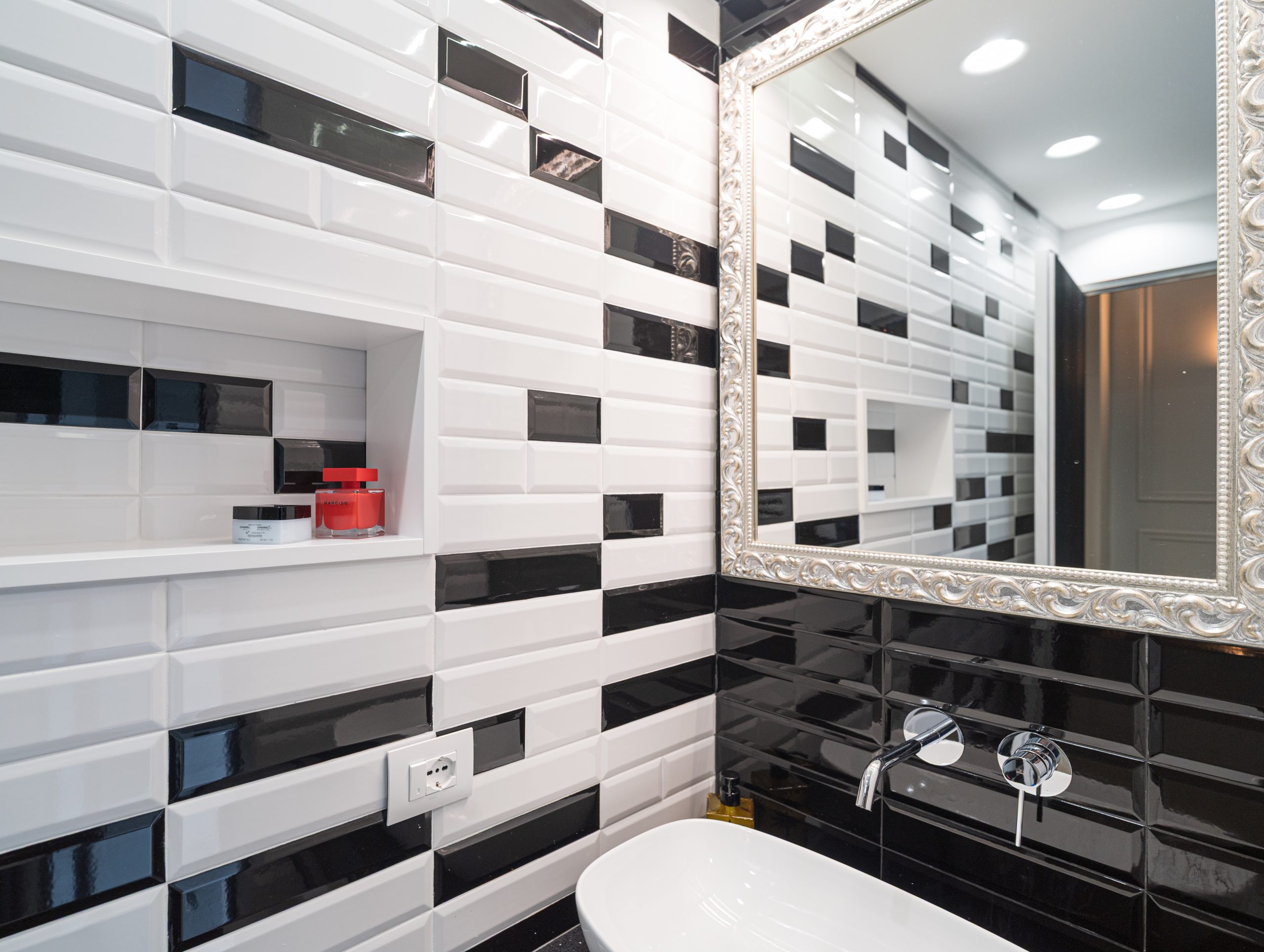 The master bedroom is spacious and welcoming with an en suite bathroom embellished with black & white style ceramics of great visual impact and with the presence of a large bathtub.