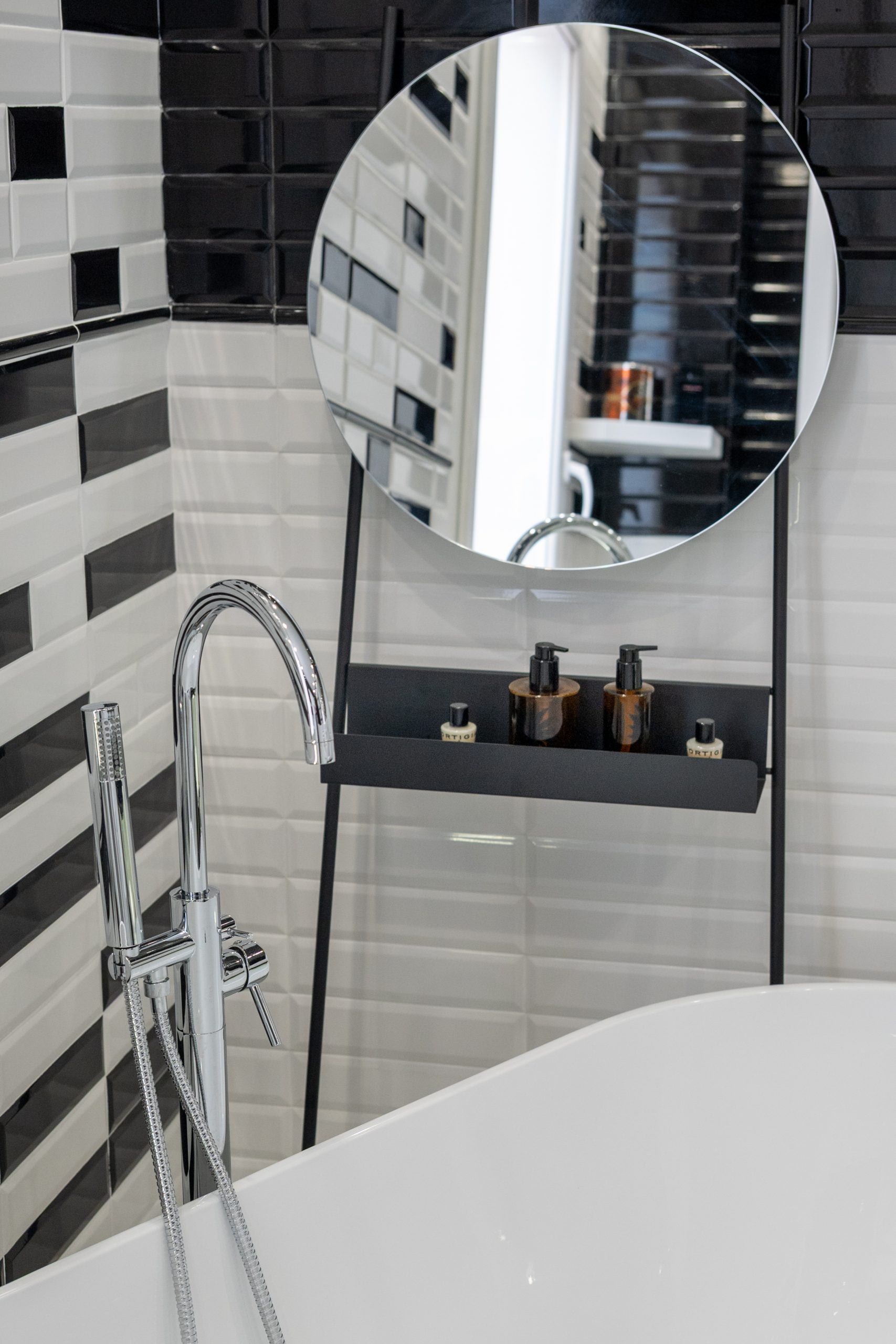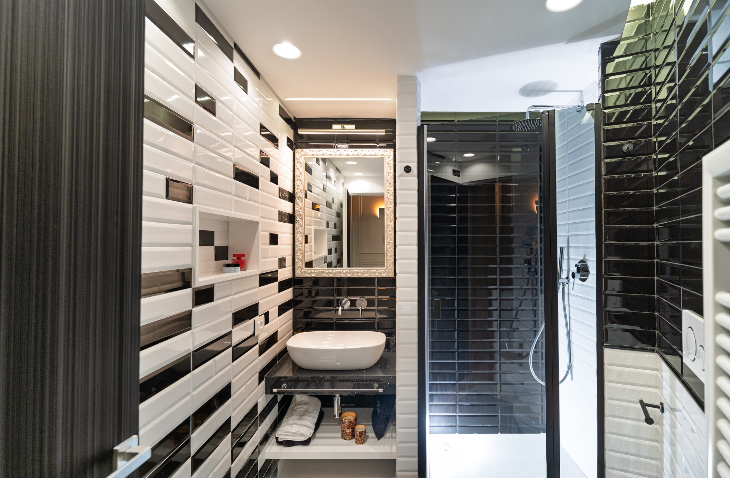 A living room with 2 beds thanks to a comfortable double sofa bed with a 20cm mattress. The en suite bathroom is embellished with black & white style ceramics of great visual impact.
